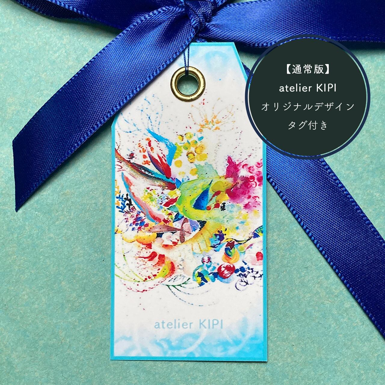 包装紙にリボンをかけて、atelier KIPI オリジナルデザインのタグをお付けします。